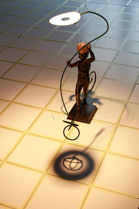 welcher an einem Stab das lineare Doppelmotiv des Innenohres trägt, auf einer Tischfläche plaziert. Einen elektrischen Strahler so