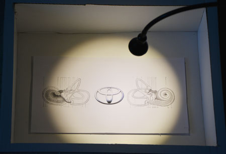 positioniert, dass der Schatten des Innenohrmotives das Emblem einer bekannten Automarke erscheinen lässt.