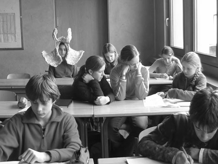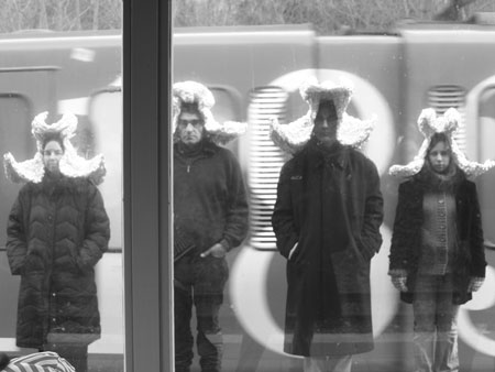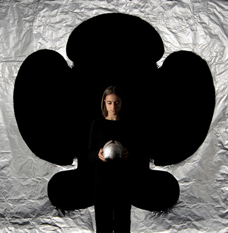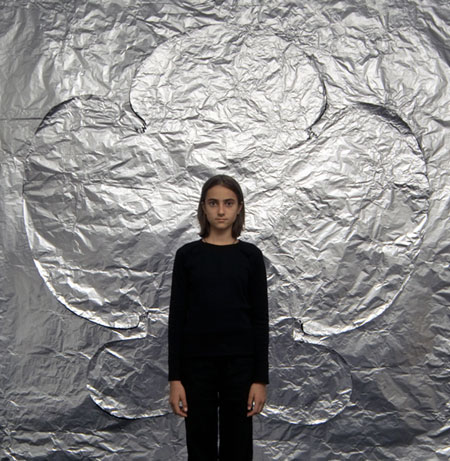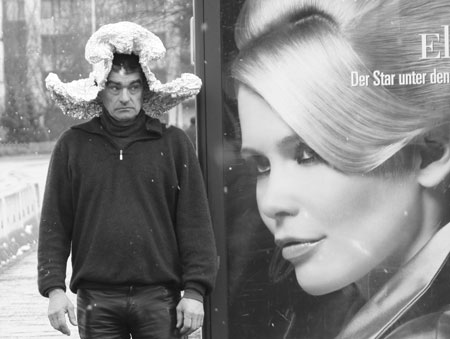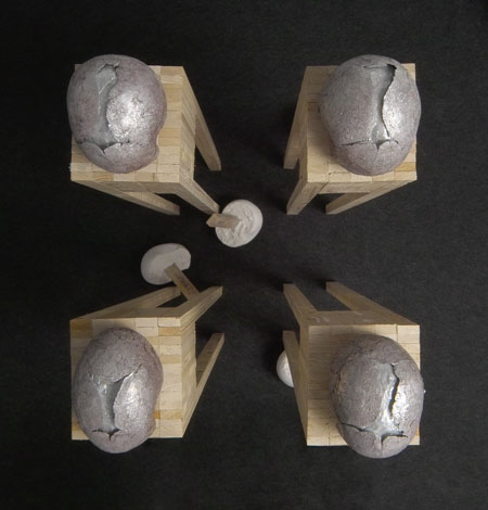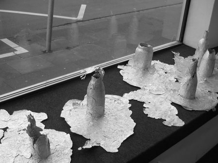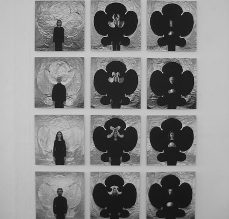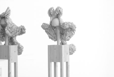 Installation, plastische Objekte, Fotografien, Galerie „Kunst 77“, Bonn, 2006Acht Personen jeweils vor einer großflächigen Membran aus Aluminiumfolie platziert. Aus dieser jeweils eine blütenartige Fächenfigur ausgeschnitten und durch Zusammenraffen und Stauchen des Materials zu einem Barock anmutenden Hut geformt. In einem zweiten Formvorgang vier von den acht Hüten jeweils über einem Gipsabguss des Kopfes der jeweiligen Person wie über einem Amboss zu ei-ner fragmentarischen Schädelform zusammengeschmiedet. die vier Schädelformen auf Sockeln, die vier anderen Hüte auf den dazuge-hörigen Schädelambossen präsentiert. die acht zurückgebliebenen Randstücke der Aluminiummembrane über Glasflaschen und über den Boden geschmiedet und das entstandene Konglomerat im Schaufenster der Galerie abgelegt. denSstudioaufnahmen,die diesen Prozess am Beispiel von vier Personen zeigen ( Figur vor Silbergrund, Figur mit Hut, Figur mit Schädel), Fotografien von den acht Per- sonen mit Hüten gegenübergestellt, die im städtischen Alltag entstanden sind.