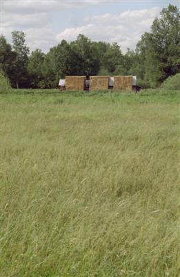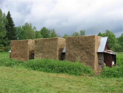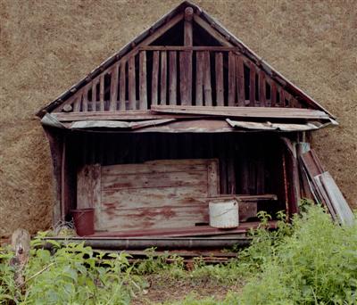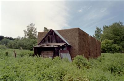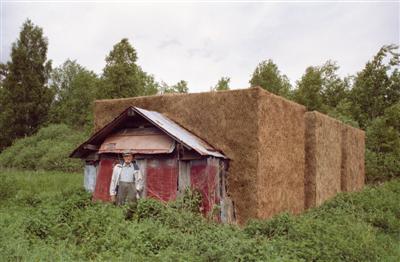 Die mit Bieberschwänzen gedeckten Holzhütten fügen sich harmonisch ins Landschaftsbild ein – bis auf die Hütte des 85jährigen Herrn Nikolai, welche durch einen Anbau verlängert und nach und nach mit z.T. angestrichenen Zinkblechen abgedichtet wurde. Die Installation fasst die 13 Meter lange Hütte in drei dünnwandige Quader aus Heu ein, deren temporäre Monu-mentalität mit der pitoresken Hüttenarchitektur kontrastiert. Das fragile Bauwerk wird dadurch seinem ehemaligen Zweck vollständig entrückt, die Stirnseiten und auch die Segmente zwischen den Quadern wirken wie in eine neue Bildhaftigkeit transponiert. Der stolze Erbauer der Hütte erschien während der Intervention täglich und konnte sich mit dem neuen Zustand seiner Hütte durchaus verbinden.