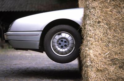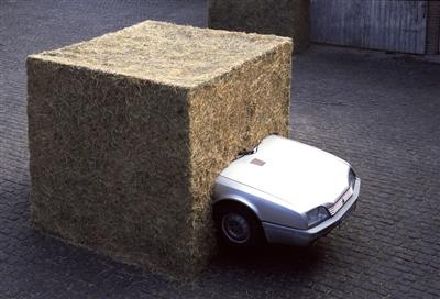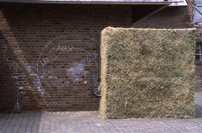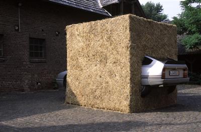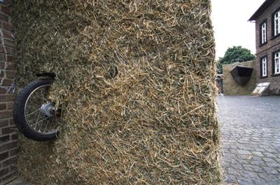 Der Bayerhof : seit einem halben Jahrhundert nicht mehr bewirtschaftet, auf dem Innenhof weisen abgestellte Fahrzeuge auf die jetzigen Nutzer hin: der hier wohnende Filmregisseur hat sein Hochseesegelschiff hier aufgebockt, ein Automechaniker hat seine gesammelten alten französischen Fahrzeuge im Stall deponiert, einige Wagen stehen vor dem Stalltor.Die Fahrzeuge sind angehoben, jeweils in einem dünnwandigem Kubus aus Heu teilweise verborgen, Teile der Objekte ragen aus der stellenweise leicht transparenten Umhüllung heraus: der gewohnte Raumzusammenhang ist gelockert, Gegenwart,Vergangenheit , verschiedene Zeitschichten, von denen die Objekte und die sie beherbergenden Gebäude zeugen, treten in ein neues, „virtuelles“ Verhältnis zueinander: “ out of time ...“