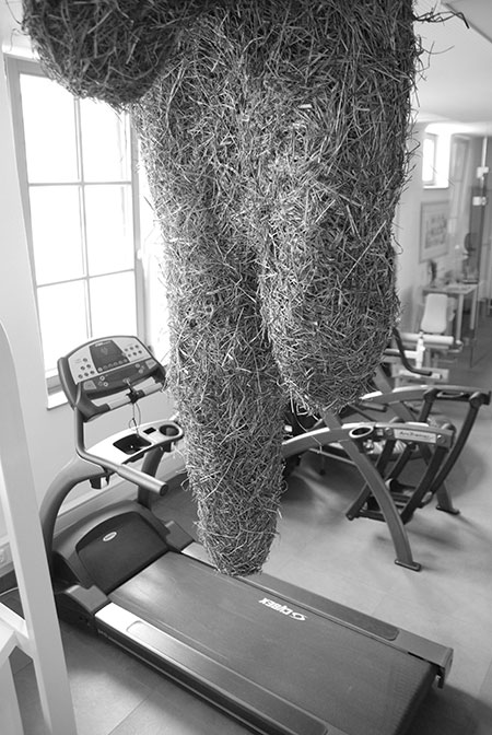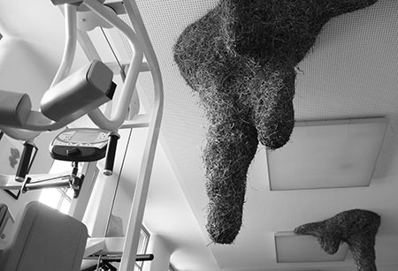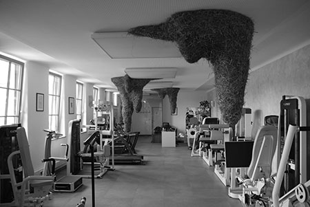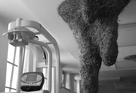 Mehrere plastische Objekte aus Heu an der Decke eines Fitness-Studios installiert.