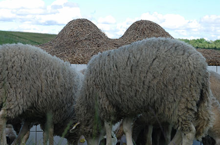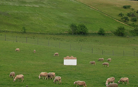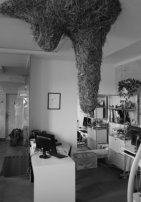 Korrespondierend dazu ein einzelnes plastisches Heu-Objekt als skulpturales Landschaftszitat