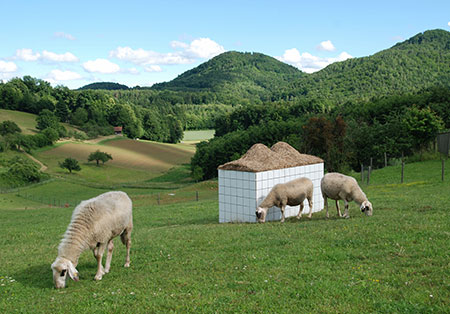 Installation, Objekte aus Draht und Heu, weiß bekachelter Sockel Gesundheitsgut „Die Klause“,